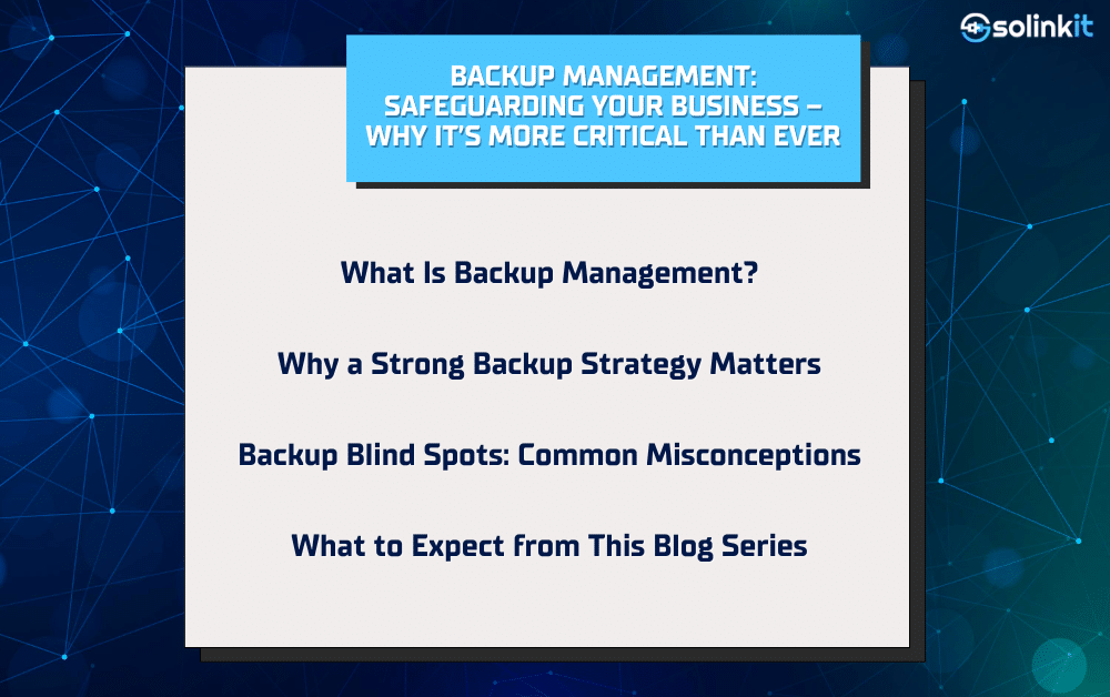 This introduction is just the first step. In the upcoming posts, we’ll break down the key elements of effective backup management—from selecting the right type of backup to restoring data when it counts. Use this series to assess your current strategy, identify any gaps, and take proactive steps toward better protection. If you’re unsure where your business stands or want expert guidance, contact SoLinkIt today. Our team can help you design a secure, scalable backup solution tailored to your needs—before disaster strikes.
